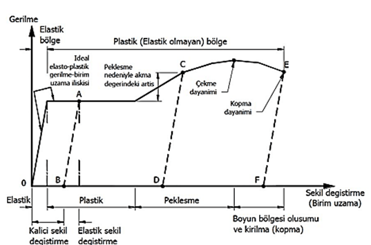 Çeliğin gerilme-şekil değiştirme diyagramı, çeliğin elastik ve plastik davranışlarını gösterir. Karbon miktarı, çeliğin bu diyagramdaki özelliklerini belirler. Yüksek karbonlu çelikler daha sert ancak daha kırılgan olurken, düşük karbonlu çelikler daha sünek ve şekil verilebilir özellik gösterir.