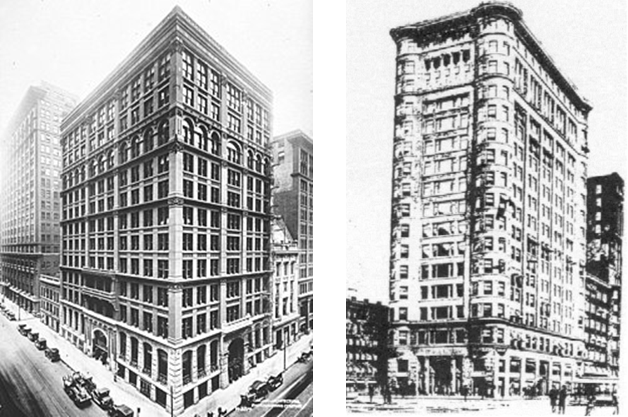 Çelik iskeleye sahip ilk gökdelenin tasarımını William Le Baron Jenney’in üstlendiği 1885 yılında Chicago’da inşa edilen Home Insurance Binası olduğu söylenebilir. 12 kat (bazı kaynaklarda ilk olarak 10 katlı inşa edildiği, 1891 yılında 12 kata çıkarıldığı yer almaktadır) ve 55 metreden oluşan bina silindir şeklindeki dökme demir kolonlar ve I profillerden yapılmış çelik kirişlerden oluşmaktadır. (1931 yılında Marshall Field’s tarafından LaSalle, Adams ve Clark caddelerini kapsayan büyük bir ofis binası inşa etmek amacıyla yıkıldı.) Yine William Le Baron Jenney’in tasarladığı ve 1891 yılında tamamlanan bir başka bina olan Fair Store Binası da çelik taşıyıcı sisteme sahip öncü yapılardan biridir.